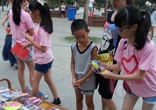 小小志愿者们在公园里设摊出售由他们出资购买和同学们捐献的书籍、玩具、手工作品等义卖品。活动现场,小小志愿者们尽情施展推销才能,吸引过往的路人和来公园游玩的人们在自己的摊位上多购买几件义卖品,奉献爱心。虽然天气炎热,小朋友们汗流浃背,但是从下午到晚上,他们一直坚持着,脸上始终洋溢着笑容。据悉此次活动总收入3635.5元,这笔钱将用于资助贫困学生和辅读学校的同学,让爱心传递。接下里,小小志愿者们准备在万达广场举办义卖活动。