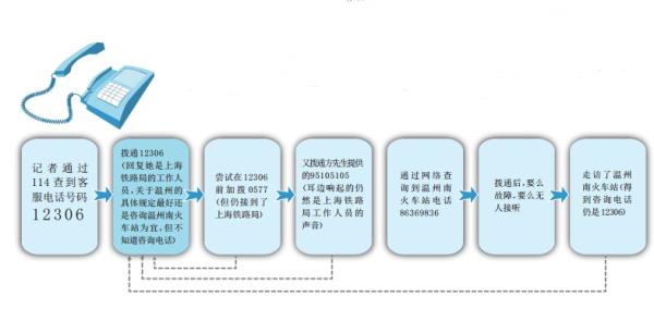 按照方先生所述,记者亲身体验了下查询过程。首先记者通过114查号台很快得到电话号码——12306,拨通后,语音提示“欢迎致电铁路客户服务中心”,根据菜单提示进入人工服务后,提示话务员忙,未能接通。重复操作后,接通的工作人员告诉记者,她是上海铁路局的工作人员,关于温州的具体规定最好还是咨询温州南火车站为宜。至于咨询电话,她表示也并不知晓。