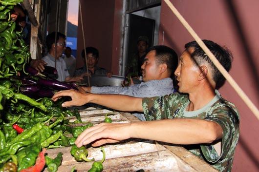 “昨晚我们在一起吃饭时,从电视上看到纸厂乡江边村最好的蔬菜种植基地完全被堰塞湖的水淹掉了,我们两家人当时就定了下来,今天一定要赶着把自家种的蔬菜采摘了送到灾区去,让受灾群众能吃上最新鲜的蔬菜。”8月10日20时,刚赶到会泽县纸厂中学受灾群众安置点就忙着下蔬菜的范芝品对记者说。