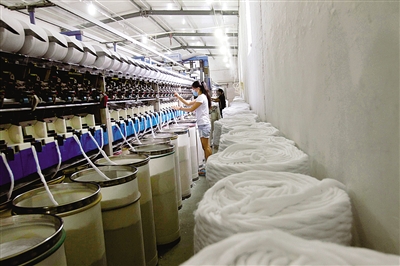 苍南县宜山镇一厂房内,纺织工人在自动生产线上作业。近年来,宜山镇投入2.5亿元对纺织行业进行技改,推动纺织产业结构升级优化。资料照片苏巧将摄
