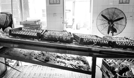 而清洗碗筷的生产流水线粗洗区附近显得很脏乱,随处可见一些碗筷上面带过来的食物垃圾。