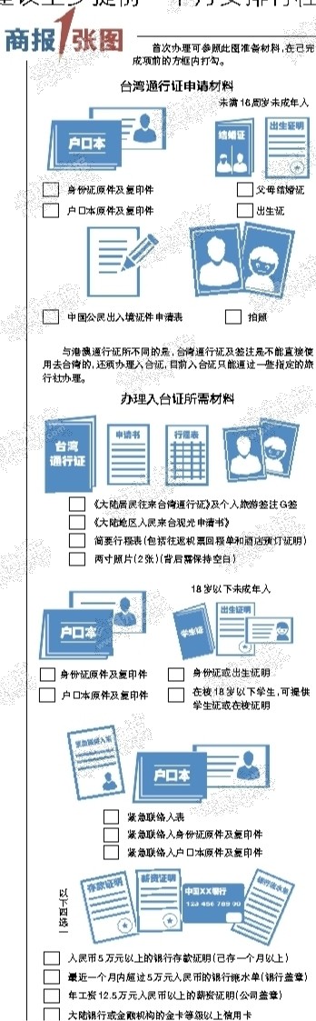 “必须凭借通行证和签注才能办入台证,另外还要提交不少材料。”旅行社工作人员介绍,入台证只需要准备好所需材料,然后找一家有资质经营大陆居民赴台湾旅游业务的旅行社代办即可,费用在200元左右。但自由行的材料中必须包括一份简要的行程表,内容要有往返机票回程单和酒店证明,同时如果财力证明选择用5万元以上银行存款证明,那么存款证明需要在申请日前1个月办理。