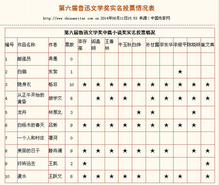 中国作家网公布的《第六届鲁迅文学奖实名投票情况表》截图