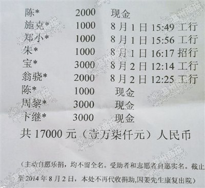“没有一个人愿意透露自己的名字。”陈廷说。“陈医生他自己应该也捐了款。”谢女士说。记者注意到,在陈廷公布的捐助名单上,姓名最后一个字被打了马赛克,其中通过现金捐助姓“陈”的人有两个。