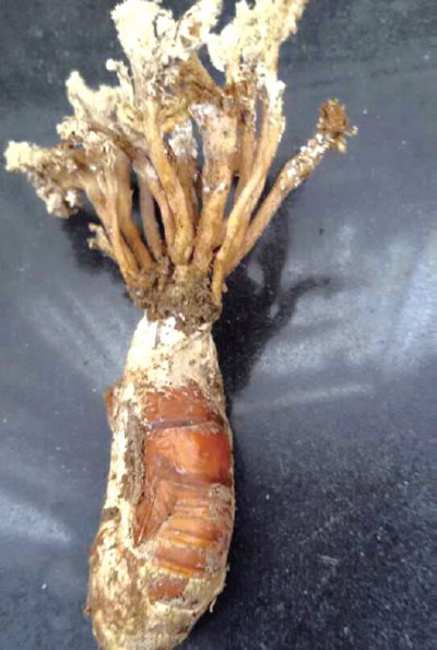 永嘉县巽宅镇界坑村村民竹园挖到的“金蝉花”。通讯员金肖武/摄