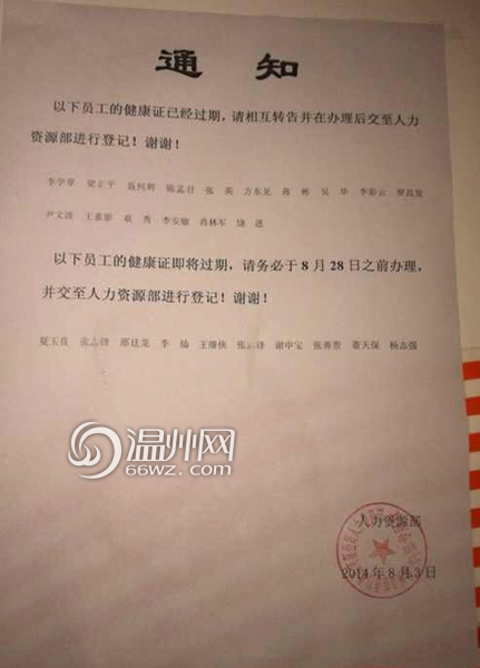 针对王先生提供的《通知》中显示,健康证已过期的有16位,即将到期的有10位。对此,田静的解释是,这份通知通常是对内告知使用的,为排除某些员工会因请假等因素影响办证,会在健康证过期前1个月发出通知,所以通知的内容会显示为已过期,即将过期的通知则是提前2个月发出。
