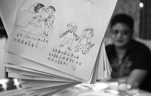 之前徐敏的漫画比较零散,基本没有保留,直到2004年他和老婆林晓丽走进婚姻殿堂后,“爱情漫画”才陆陆续续多了起来。从2004年到现在,徐敏画了一百多幅家庭漫画作品,他一脸幸福地对老师伯说:“到今年和老婆结婚已经十周年了,前段时间整理漫画,里面记录了一些跟她从认识到结婚很多有意思的生活琐事,回忆一下还是挺有意思的。”