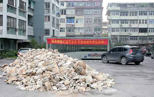 小区车库归属引发矛盾 村委会用土石堵住出入口