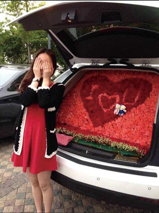 当邱添怡从银行出来后,吕志武把车子的后备厢打开,映入眼帘的是999支玫瑰花拼成的爱心图案,邱添怡用手挡住眼睛,激动得说不出话来。“平复一阵后,她却对我说,这个点子好俗,别人都用过了。”吕志武告诉记者,邱添怡嘴上虽然吐槽没有新意,但是她却很受感动。999支玫瑰在她车子的后备厢里放了一周,都舍不得扔掉。“花都开始烂掉了,她还不肯丢,到最后是我逼她,她才勉强答应丢掉的。”