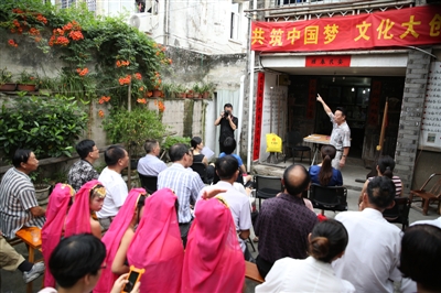 道坦是舞台,村民是观众,农村诗社会员是演员……在永中街道棋盘村旭日路39号的民宅里,常常会传来热闹的掌声和热烈的讨论声,这里就是区农民诗社负责人潘峰自己建设的文化礼堂。作为当地一位小有名气的宣讲员,由他自己创作并巡讲的“精品党课”已不下上百场,如今他又自费筹办了“文化礼堂”,让附近的村民也都享受到了家门口的精彩党课。