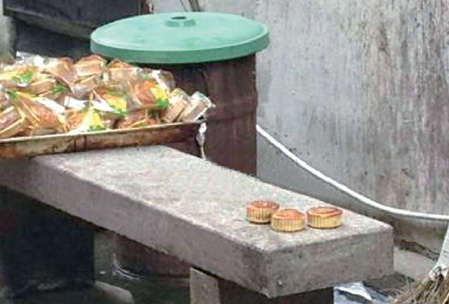 叶女士提供的照片显示,石凳上堆放着一箩筐盖月饼成品,还有三个未包装的月饼被直接丢在了石板上。