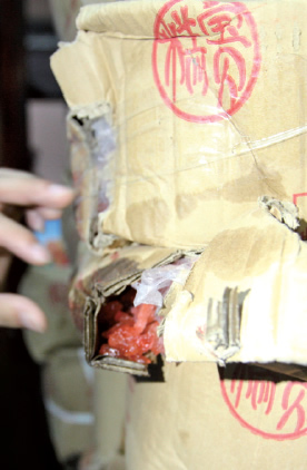 仓库内,积水退后的泥泞地面上堆放着成箱的果料、馅料及白砂糖等月饼原材料,不少纸箱已经潮湿、破损,一些原料暴露在外。“前几天仓库漫水,淹了些原料,这些不会拿来做月饼的。”作坊老板陈女士连连解释,称这些受淹的原材料马上会被清理。陈女士还否认了曾经把受潮的成品月饼晾晒回收,“都丢到垃圾桶里去了。”