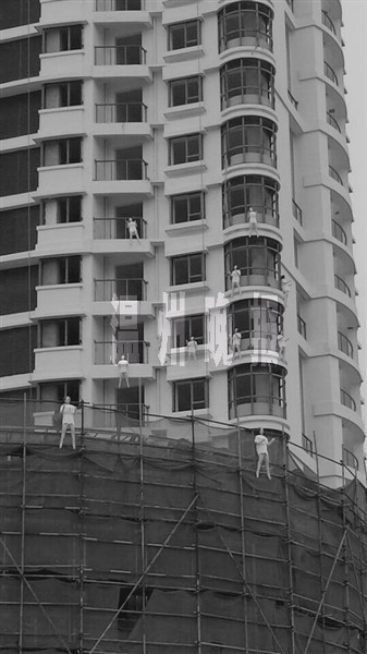 温州网讯 昨天上午10时许,市民陈女士经过苍南灵溪玉苍路时,突然发现一在建商品楼外侧站着27个年轻女子,似乎想要跳楼,楼下站满了围观的群众,其中还有几个小孩子。受到惊吓的陈女士走近一看,脸顿时红了,原来那些年轻女子都是“充气娃娃”,个个体态丰满露出修长的大腿,每个都只穿一件白色T恤衫,上面写有“天汇嘉园,无耻xx(人名),强奸民意”十二个字,四周都是哄笑声。几分钟后警方赶到,将参与挂“充气娃娃”的20多人全部带走。