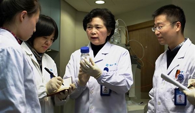 图为李兰娟与同事交流新产品的性能 李巧世提供