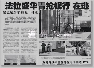 昨天下午,记者在网上找到《侨报》就此抢劫案的报道。报道中称:“法拉盛5月6日下午发生一起银行抢案,一名20岁的华裔男子进入道名银行行抢,并宣称自己持有炸弹,行员机灵地给抢匪一包藏有自动爆破染色包的现金。抢匪逃跑时在一个街口因为染包爆破,全身染满红色颜料。法拉盛辖区109分局出动大批警力搜查嫌犯下落,截稿时尚无人落网。”