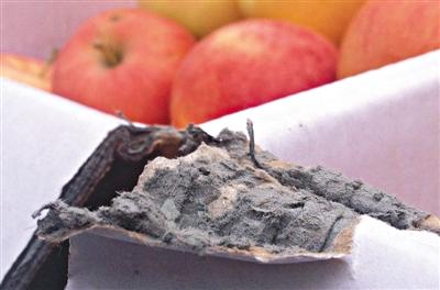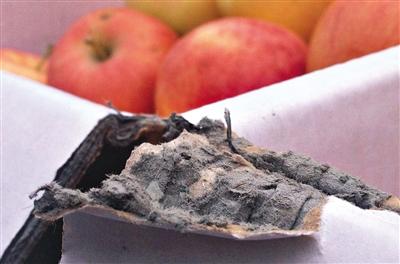 近日,新京报记者调查发现,一些果品批发市场商贩使用“加重纸箱”包装苹果,此种箱子类似此前被频频曝光的“水泥纸箱”,只不过因批发市场严查,纸箱夹层中的水泥块被换成了木浆或纸浆。
