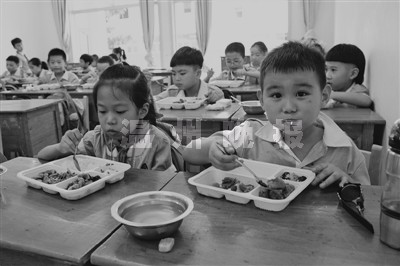 中午11点30分,准时开饭。领到午饭的孩子们撕开薄膜,土豆、蒸蛋、排骨都是孩子们的最爱。“这菜真好吃,比上学期的盒饭要好吃,我喜欢吃。”四年级的唐雪纯告诉记者。