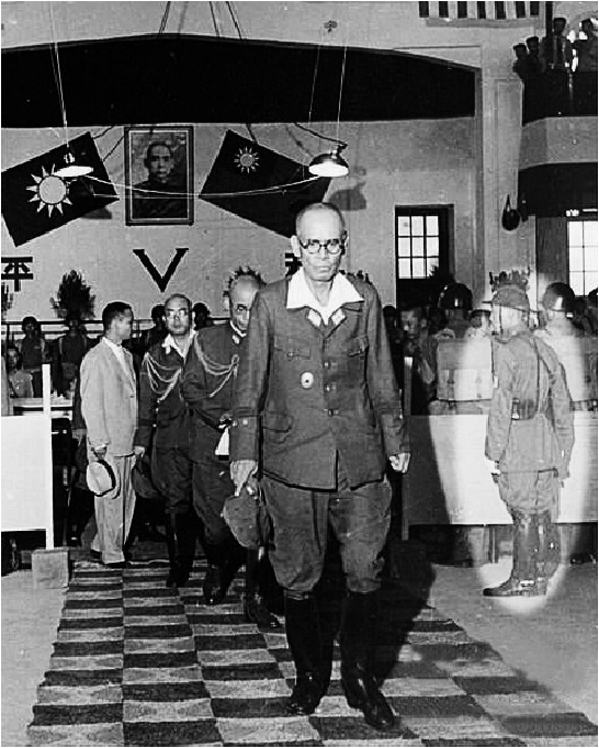 受降仪式定在上午9时。潘庭槐记得,受降仪式时间很短,也就十几分钟。当时,中方代表坐在北面宽大的受降席上,日方则坐在南面窄小的投降席上,东西两边则坐着中外来宾和各国记者。