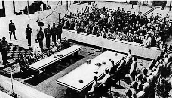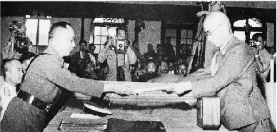 日军代表退出会场后,何应钦即席发表广播演说。言毕,全场掌声雷动。