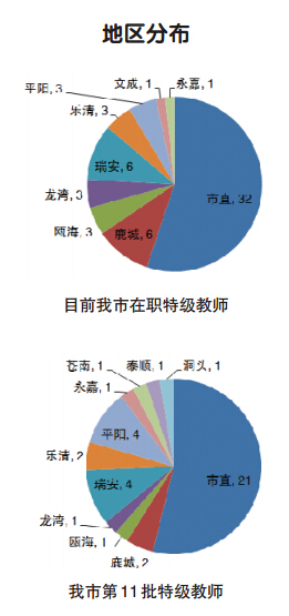 目前在职的特级教师中,在市直学校或单位的有32位,占55.17%;苍南、洞头、泰顺县空缺,其他各县(市、区)只有1至6位不等。