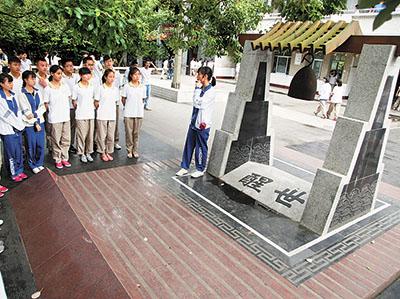 9月2日,四川阆中中学学生在该校“炸弹钟”前开展爱国主义教育活动。“炸弹钟”由抗日战争时期日军轰炸阆中时未爆的航空炸弹改制而成。王玉贵摄(人民视觉)