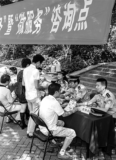 昨天上午,洪殿派出所在辖区摆摊介绍“群众外出安防服务工作”流程。 赵用 蔡剑平 摄
