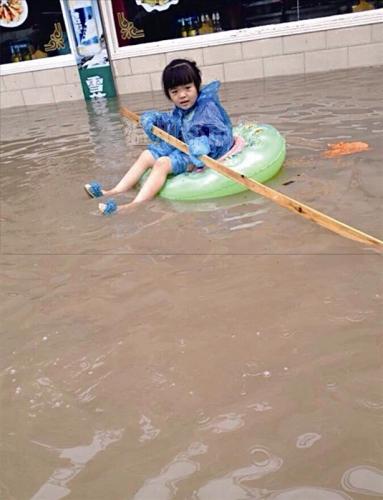 鳌江一路面满是积水,有小朋友在“划船”。图片来自“张氏晟瑜的围脖”的微博