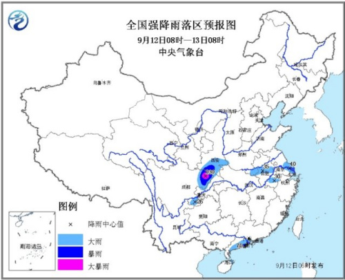 据了解,四川盆地北部、陕西南部等地的部分地区有暴雨,局地大暴雨(100~150毫米),部分地区并伴有短时雷雨大风等强对流天气。另外,广东西南部沿海、海南等地的部分地区有中到大雨,局部有暴雨。中央气象台9月12日06时继续发布暴雨蓝色预警。