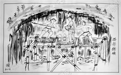 由于明矾矿蕴藏在矿山中,矿工们首先需要搭建架子日夜采集矿石。
