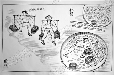 冷却过后,矿工将桶中的明矾矿石扒出,担去进行风化处理。