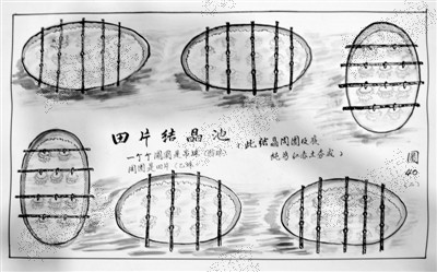 矿砂与溶有明矾的水被放入大桶中进行结晶,桶上挂有四根系着绳子的竹竿,明矾会结晶在绳上与桶壁上。