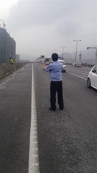8点30分许,消防人员闻讯赶到现场。这时,惊险一幕发生了:金某突然起身,站在高架桥的水泥护栏上,身体摇晃时摔倒在桥上。金某又迅速起身,双手抓住护栏想纵身往桥下跳。就在金某的一只脚跨出护栏瞬间,陈警官冲到他身边,抓出了他的皮带和衣领,用力将他拉回桥面,并与几名协警将其按倒。