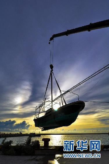 9月14日,在海南省三沙市,一艘渔船被吊往岸边避风。新华社记者夏一方摄