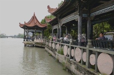 在河道西岸,经过中心桥往前走到塘下老公园——银河公园,岸旁纳凉的人渐渐多了起来,不远处的树下有个白色长廊,不少人或坐或躺,在绿荫下享受河边微风。