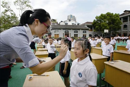 老师为一年级新生点朱砂启智。