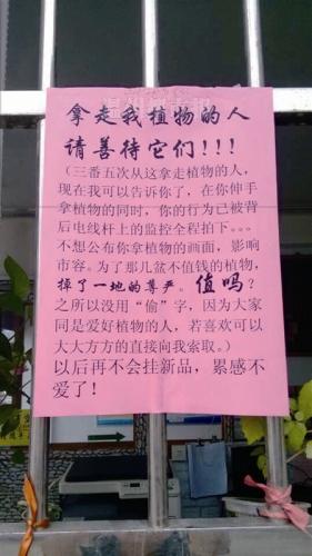 乐清女孩养盆栽接连被盗 贴“大字报”令小偷归还