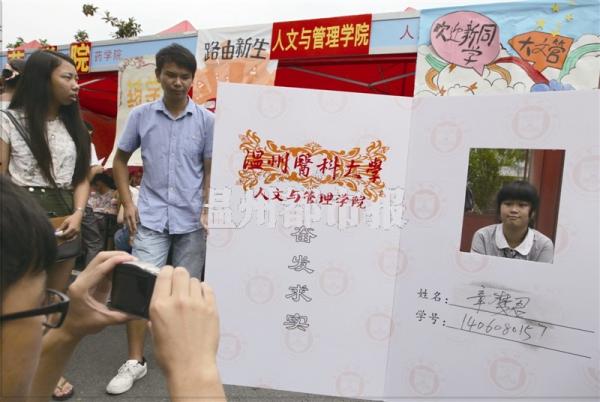 在温医大人文与管理学院的迎新站前,一个硕大的“学生证”颇引人注目。这张“学生证”长2米、高1.6米,印有温医大的水印,右半部分仿照真正的学生证写着姓名、学号和学院,姓名、学号均可擦写。这是文管学院的学姐和学长们制作的新生拍照背景,新生在“学生证”后面,将头伸在证件上空出的照片位置,便能拍出一张逼真的“学生证”,照片将由学院存档,保留至4年后的毕业典礼上使用。