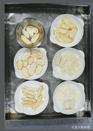 为了调查更加全面,记者又分别买了一家水产店自制的鱼饼、超市包装好的永高鱼饼、强能公司的强新牌鱼饼各一份;随后在另一家农贸市场买了店家自制的鱼饼一份;加上记者之前在池先生所说的农贸市场买的一份,共5份鱼饼,分别按照池妈妈所讲的程序:洗净、蒸熟、切块,分别放在五个盘子里,并且做好编号,依次为1号水产、2号永高、3号强新、4号农贸、5号新城。而池先生从家里带来的“荧光鱼饼”标为6号。