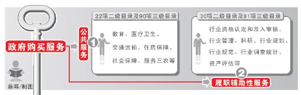 其中,公共服务项包含教育、医疗卫生等22项二级目录及90项三级目录;政府履职辅助性服务项包含行业资格认定和准入审核、行业管理、科研、等30项二级目录及81项三级目录。