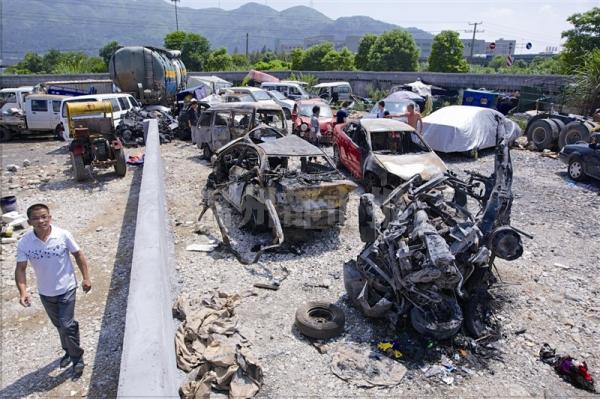 而在离事故现场不远的一处事故车辆停车场里,13辆在事故中有牵涉的车辆被停放在这里。其中5辆车子被火烧毁,大多仅剩下车架,其中一辆汽车被烧得严重变形,完全分辨不出车型、车牌号和颜色。此外,有7辆车存在不同程度的撞伤,多是车头、车尾或车身出现凹痕。还有一辆“龙工”牌大铲车,外观上没有发现新鲜的撞击痕迹,但也被押送至这里。