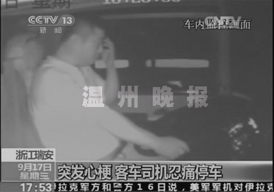 昨天17点53分,中央电视台新闻频道《新闻直播间》播出一则新闻:瑞安至杭州客车司机贾纪东在开车途中突发心肌梗塞,而他仍是忍痛停好车,保证了全车人的安全。