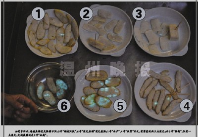 昨日报道,市民池先生家吃剩的鱼饼,半夜会发光。为了调查原因,记者做了个实验,前天在市场上另买了5份鱼饼(其中一份和池先生所吃的为同款鱼饼),连同池先生吃剩下的鱼饼,放在暗室内观察。结果发现,池先生吃剩的鱼饼,以及记者所买的同款鱼饼,都发出了荧光,其他4款鱼饼则“不动声色”。