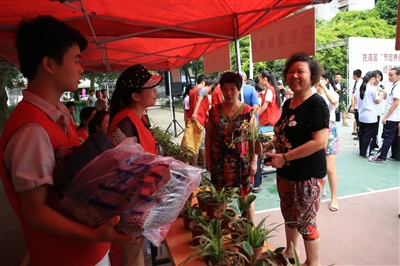“这个活动真实在,不仅将家里的旧衣服、旧报纸变废为宝,还可以获赠盆栽,美化环境。真是一举两得啊。”昨天,在蒲州街道雁湖社区举办的节俭养德节约行动经验交流现场会上,社区居民林老伯深有感慨地对记者说。当天下午,在区文明办和蒲三社区的组织下,活动现场共收到社区居民捐赠的数百件旧衣服和若干旧图书,温州科技职业学院15名学生志愿们向居民捐赠了200余盆栽,还辅导温州育英学校40余名初中新生如何利用废弃饮料瓶制作盆栽,给他们上了开学第一堂人生道德课。 ( 叶晓东 陈灵丽 摄)