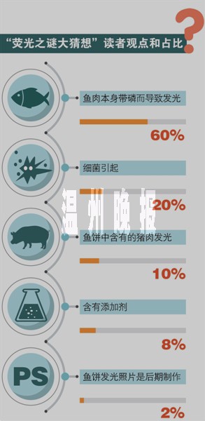 读者王先生说,自己从小跟随父母出海打鱼,晚上经常看到鱼类荧光点点,甚至用手抓鱼之后,掌心都是荧光。他说,许多鱼本身就带磷,会发光,不排除这类带磷的鱼,做成鱼饼后还会发荧光。持此观点的读者不在少数,约占来电的60%。