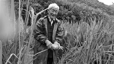 但从80岁开始,老人耕种至今。他领记者去看临近收成的田地时,眼前层层叠叠的金黄稻浪,让人深信不疑,更让人感佩不已。但记者还是想拉直心中的问号:是什么原因,让老人坚守耕作这片土地?