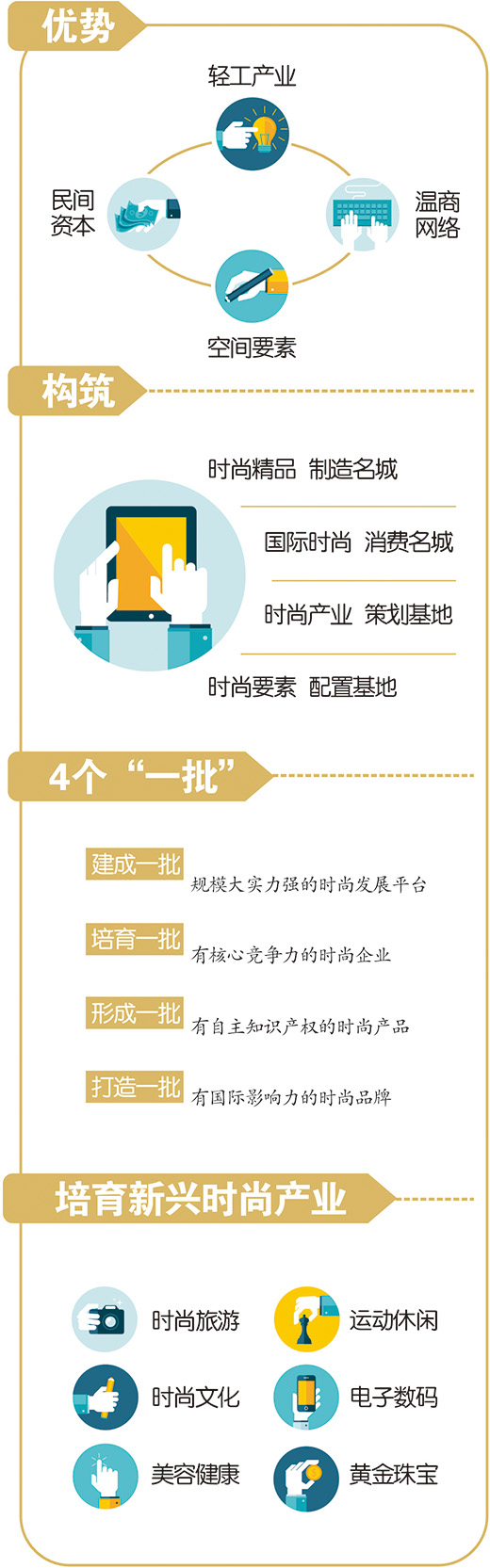 对于打造时尚之都的路径,《中共温州市委关于发展时尚产业建设时尚之都的决定》里有清晰的描绘:深入贯彻落实中央和省委重大决策部署,紧紧围绕“赶超发展、再创辉煌”战略目标,深入实施“十大举措”,发挥轻工产业、温商网络、民间资本、空间要素四大优势,坚持智造和消费双驱动,积极构筑时尚精品制造名城、国际时尚消费名城、时尚产业策划基地、时尚要素配置基地,建成一批规模大实力强的时尚发展平台,培育一批有核心竞争力的时尚企业,形成一批有自主知识产权的时尚产品,引进和打造一批有国际影响力的时尚品牌,时尚产业综合实力和竞争力明显提升,逐步建成智造发达、品牌荟萃、消费集聚、市场活跃、影响力大的时尚之都。