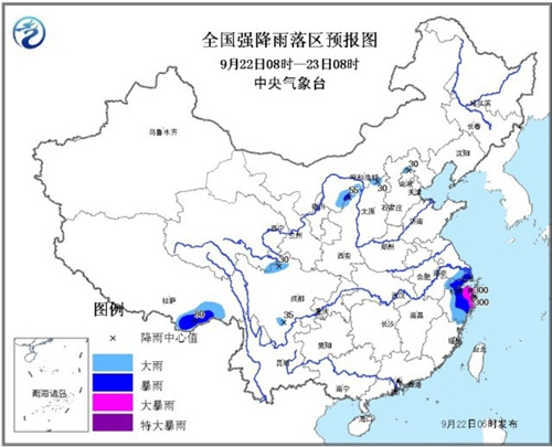 22日8时至23日8时,青藏高原东部和南部、西北地区东部、内蒙古中东部、华北北部、东北地区西部、云南、江淮、江南东部、海南等地有小到中雨,其中,浙江中东部、江苏南部、上海、西藏东南部等地有大到暴雨,浙江东部的部分地区有大暴雨,局地有特大暴雨(250~300毫米),上述部分地区并伴有短时雷雨大风等强对流天气。东海将有7~11级大风,黄海南部海域将有6~9级大风。