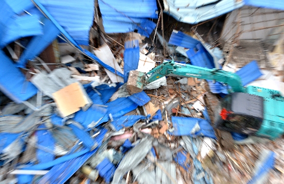 挖掘机舞动长臂,乐清市南大街服装市场内的违建铁棚瞬间被撕出一道口子。9月19日上午,乐清市委常委、常务副市长李银巧率由安监、住建、供电、消防、行政执法、电信、移动等多部门和乐成街道工作人员组成的联合行动组,对市区南大街服装市场存在重大火灾隐患的违法建筑进行拆除。