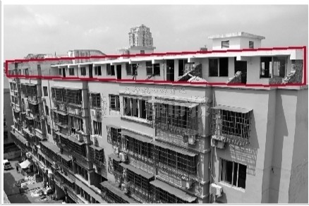 兴利嘉园A、B两幢的层高都是6层,每幢楼顶盖了一排建筑,共分割成18个小房间,其中A幢8个,B幢10个。每个房间面积有30多平方米,开设2道门和2扇窗户,其中一些窗户已安装铝合金和玻璃。