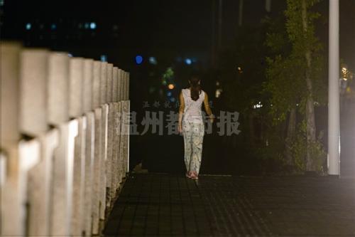 昨天晚上9时许,一女学生行走在漆黑的茶山高教园区北入口道路上。姚卡/摄